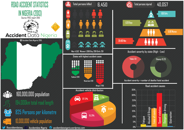 According to the Federal Road Safety Corps (FRSC) annual report for 2013, using a total population of 160 million people in Nigeria, the total road length of 194,000 kilometres and total vehicle population of 10 million, the number of persons per km of road was 825.